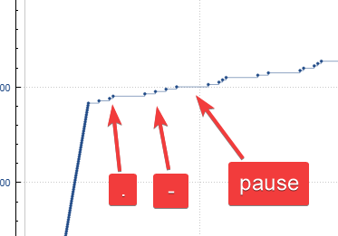 Now almost all traffic was sent in 2 seconds, then we see a major change in the packages per second. This correlates with a TCP stream that start arount 12:37:12. Now I had a real tough time solving this one, and after getting a hint, it was right in front of me. Using Wireshark’s tool TCP Stream Graph and looking at the time sequence, we see a clear pattern: